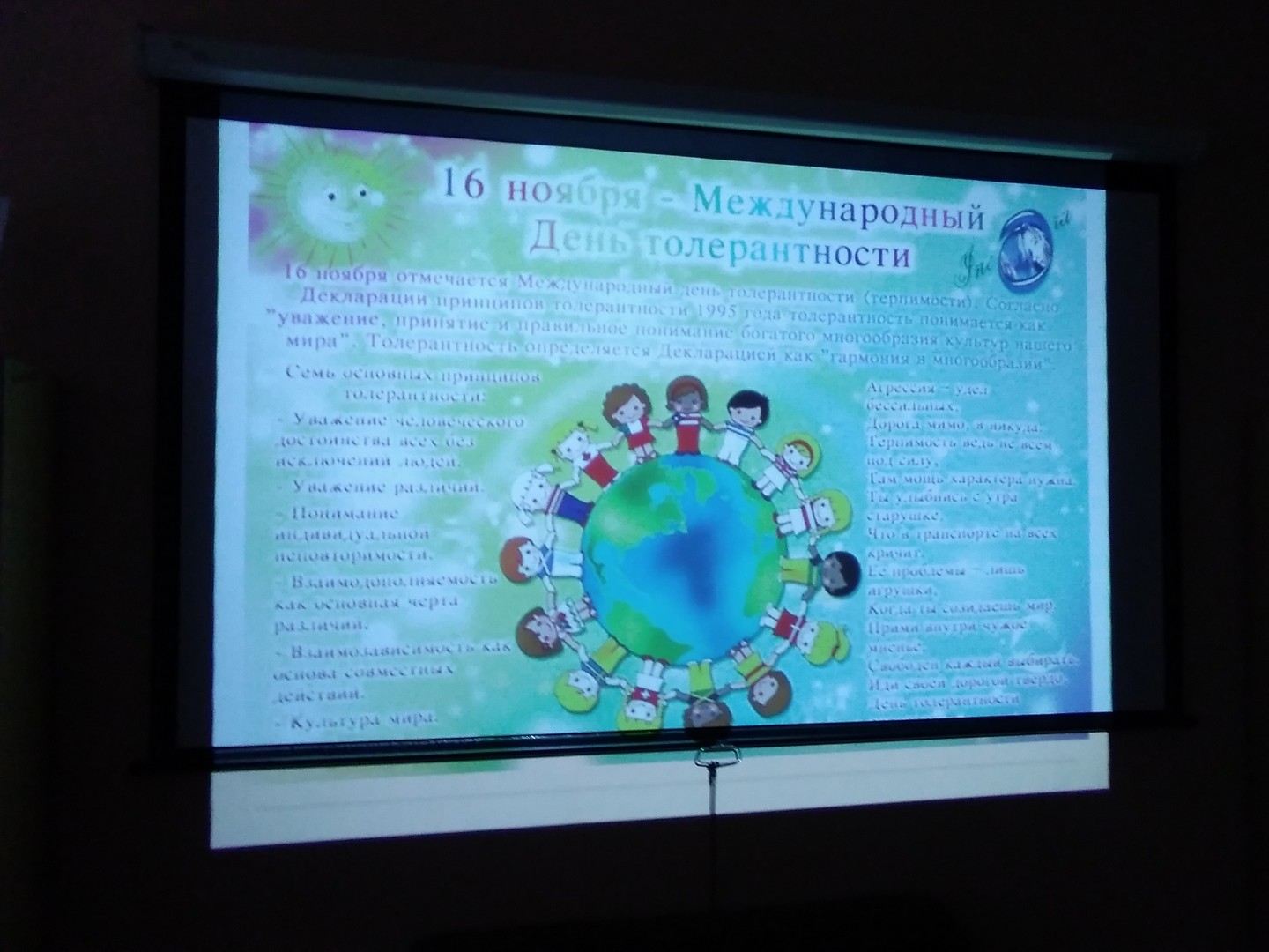 12 ноября для учащихся 5 «А» и 6 «А» классов состоялось библиотечное мероприятие «Толерантность – дорога к миру», проведенное в рамках гражданско-патриотического воспитания к Международному Дню Толерантности.