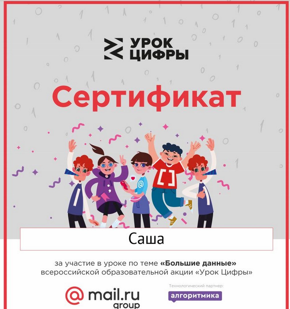 13-18 ноября наша школа приняла участие во всероссийской акции «Урок цифры».  Урок по теме «Большие данные» прошел в 4-х, 8а, 10-х, 11 классах. Ребята познакомились с понятием «Большие данные», профессиями, которые существуют в мире обработки больших данных. Также ученики попробовали себя в роли обработчиков больших данных, пройдя тренажер на сайте «Урок цифры».