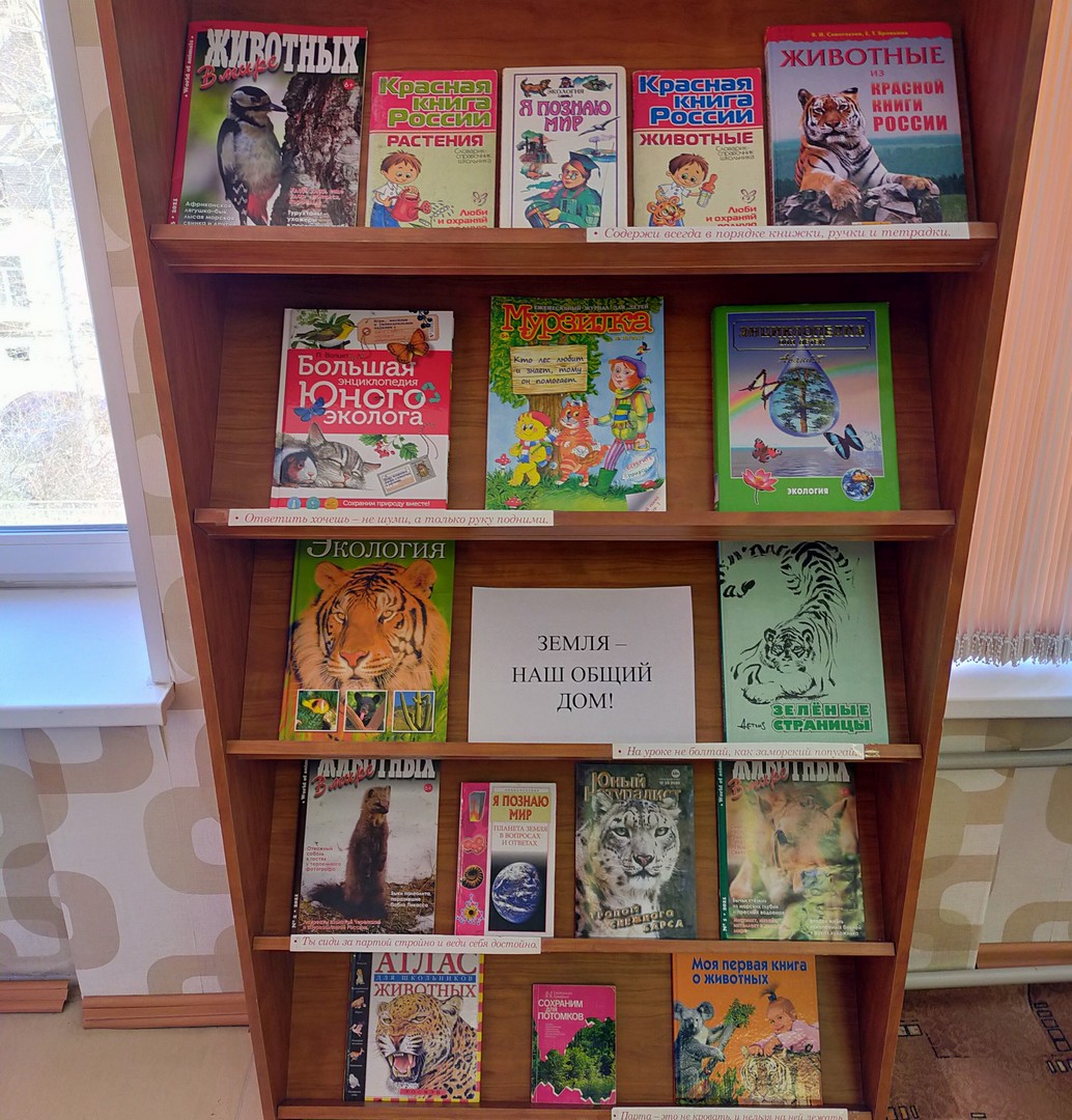 Обучающиеся побывали на книжной выставке «Земля – наш общий дом!»: прослушали обзор и выбрали книги для прочтения и изучения. Они приняли участие в мастер-классе: выполнили творческое задание, создав коллаж «Сохраним нашу планету» и ответили на вопросы литературной викторины «По страницам красной книги», закрепив пройденный материал. Зав. библиотекой Антонова А.А.