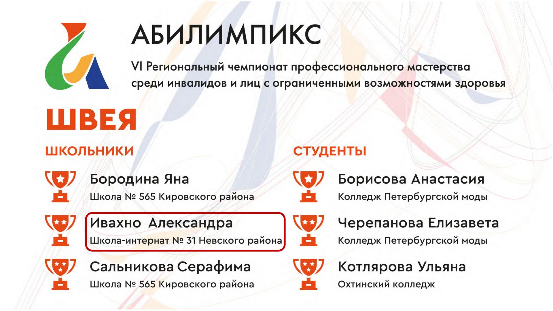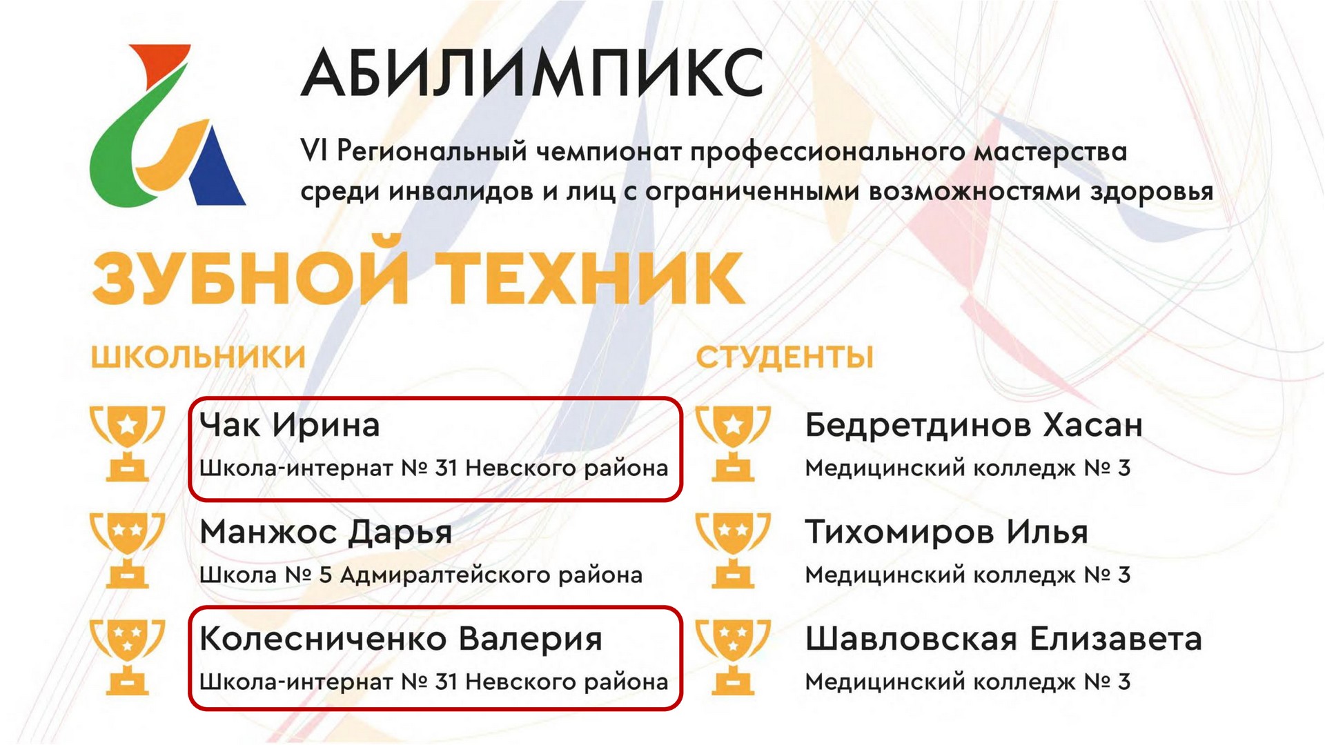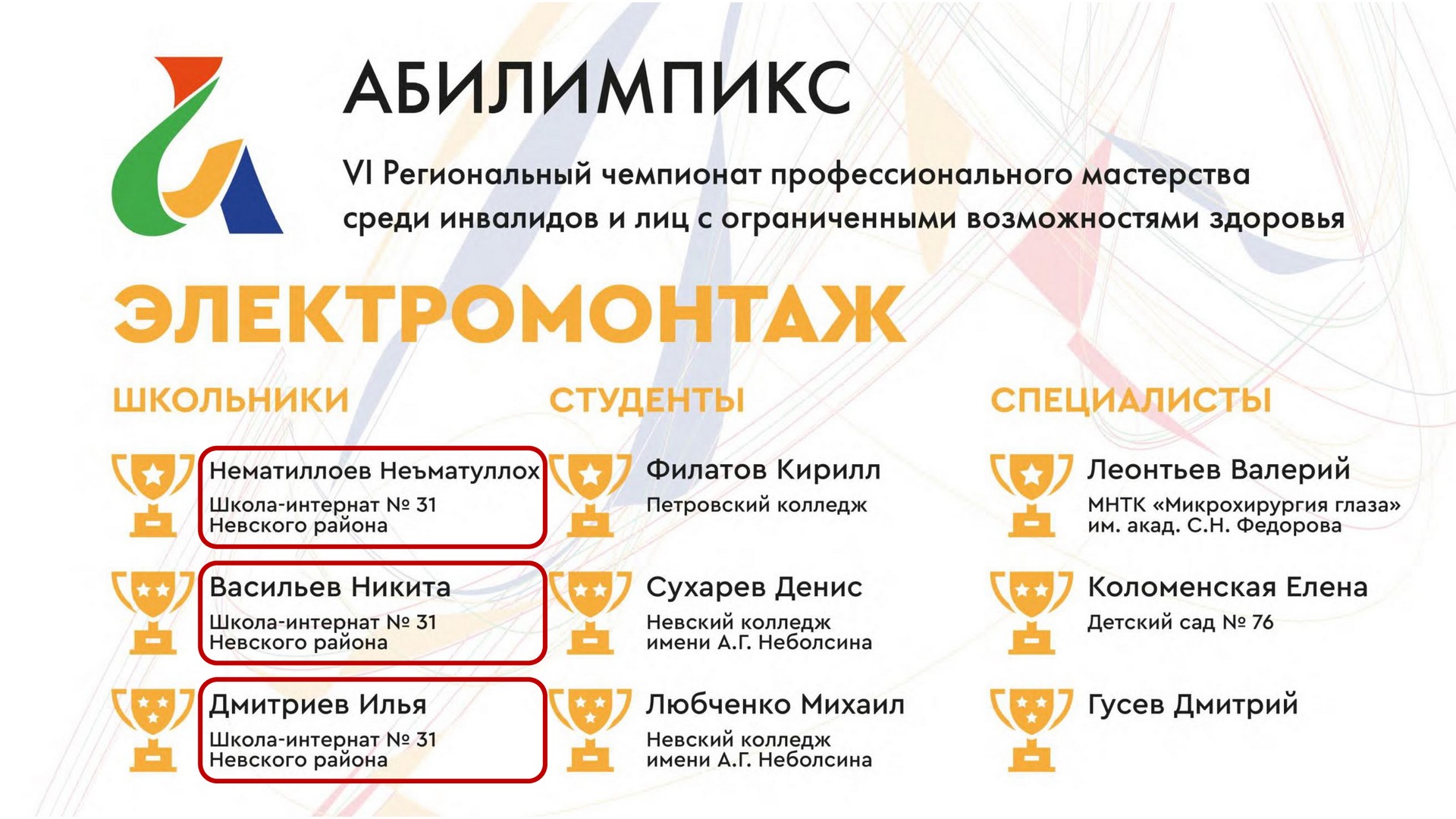 11 октября 2021 года в школе торжественно наградили участников и победителей VI Регионального Чемпионата профессионального мастерства среди инвалидов и лиц с ограниченными возможностями здоровья «Абилимпикс-2021 Санкт-Петербург». Из шестнадцати участников у нас 10 победителей разного уровня в разных компетенциях. Тех ребят, которые заняли первые места, впереди ждут отборочные туры и участие в VII Национальном Чемпионате «Абилимпикс» в Москве. Мы желаем им победы!