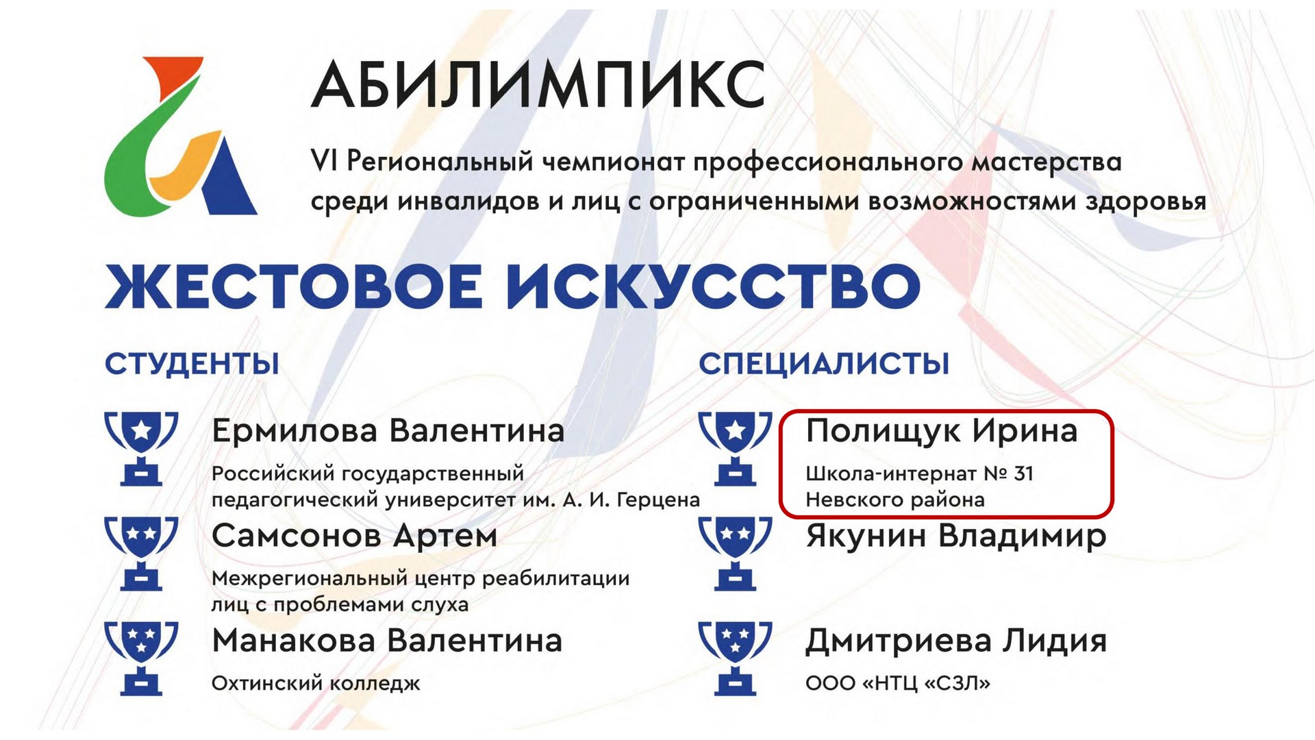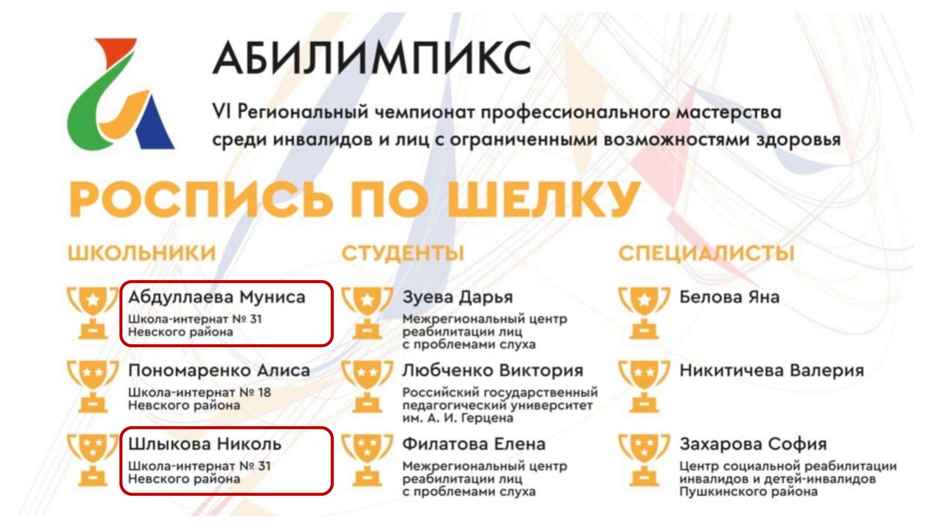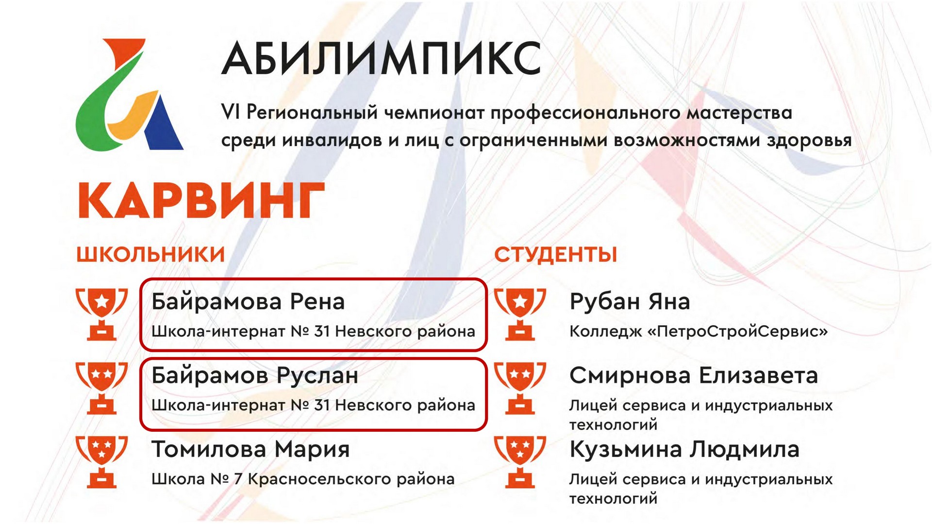 11 октября 2021 года в школе торжественно наградили участников и победителей VI Регионального Чемпионата профессионального мастерства среди инвалидов и лиц с ограниченными возможностями здоровья «Абилимпикс-2021 Санкт-Петербург». Из шестнадцати участников у нас 10 победителей разного уровня в разных компетенциях. Тех ребят, которые заняли первые места, впереди ждут отборочные туры и участие в VII Национальном Чемпионате «Абилимпикс» в Москве. Мы желаем им победы!
