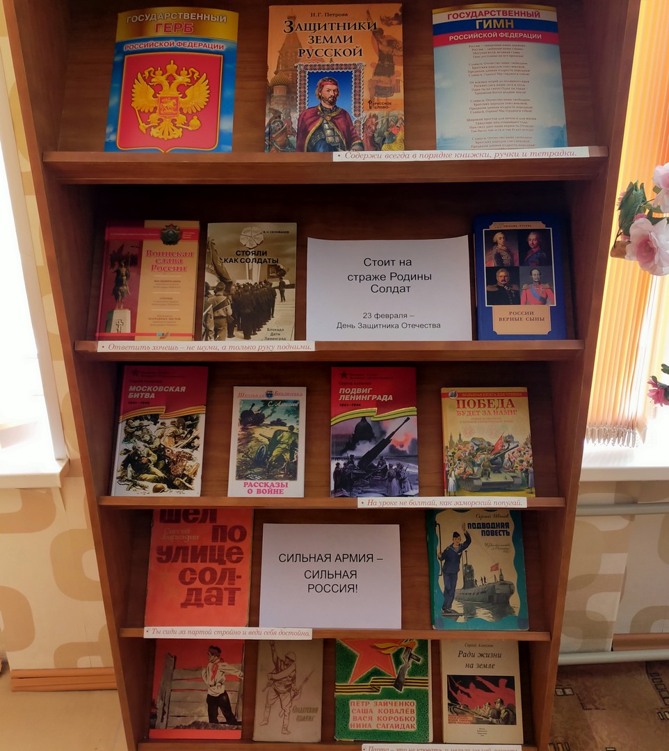 23 февраля Россия отмечает День Защитника Отечества. В связи с этим в школьной библиотеке для учащихся было проведено занятие «Стоит на страже Родины Солдат» в рамках гражданско-патриотического воспитания.