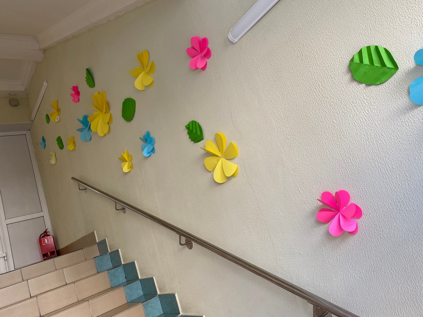 В школе Для учителей и учеников ожидал яркий, впечатляющий подарок к 8 марта на лестнице... Дети старшей школы сделали нашу лестницу очень по-весеннему. Когда на улице все начинает таять, а у нас в школе уже цветочки появились.
