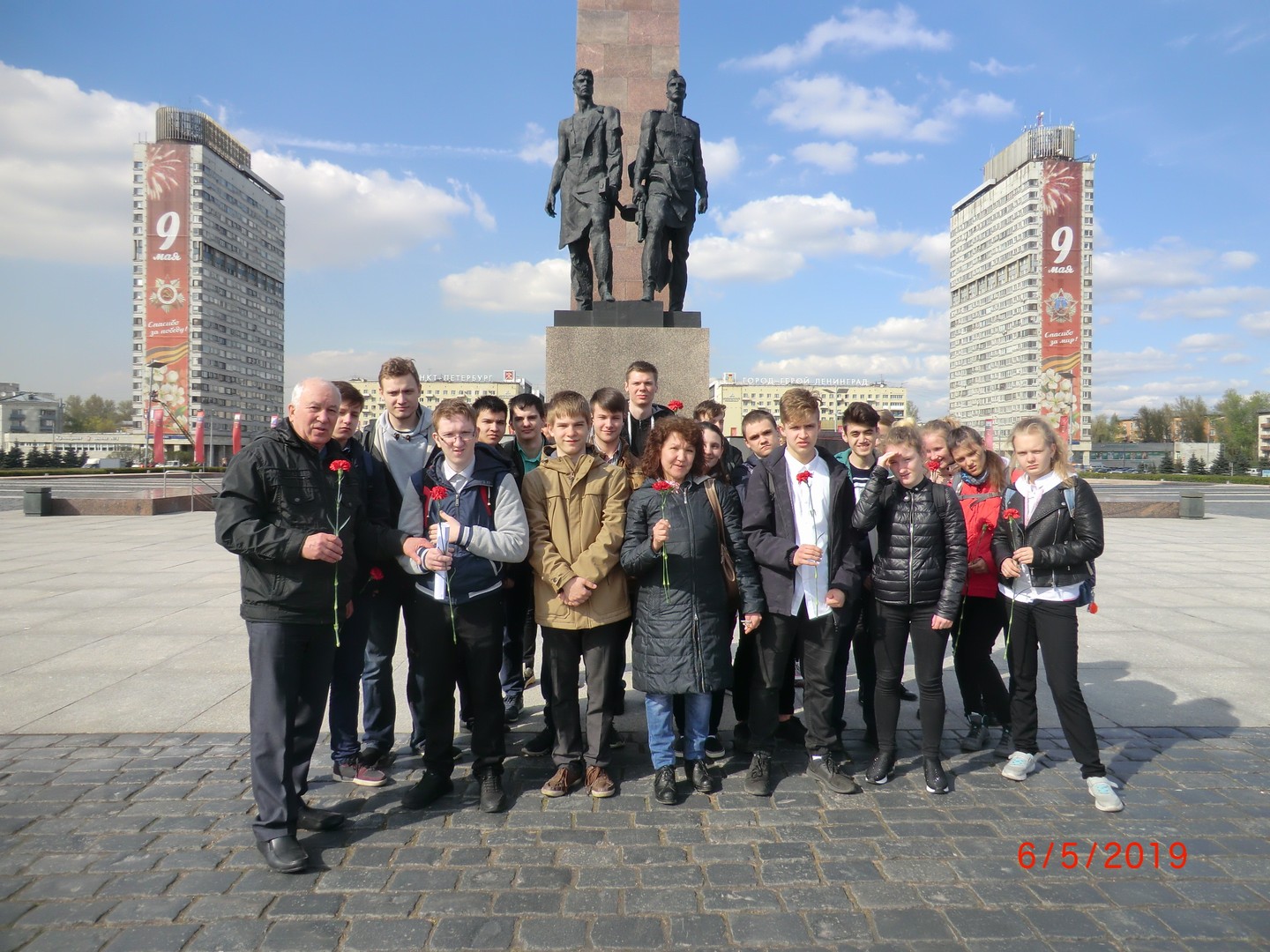 6 мая 2019года учащиеся старших классов возложили гвоздики героическим защитникам Ленинграда на площади Победы.