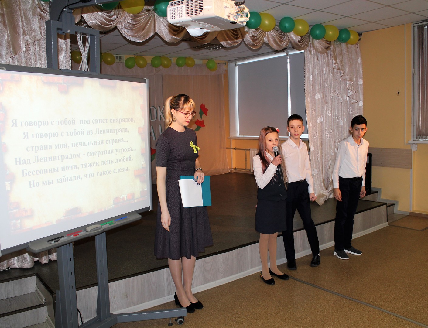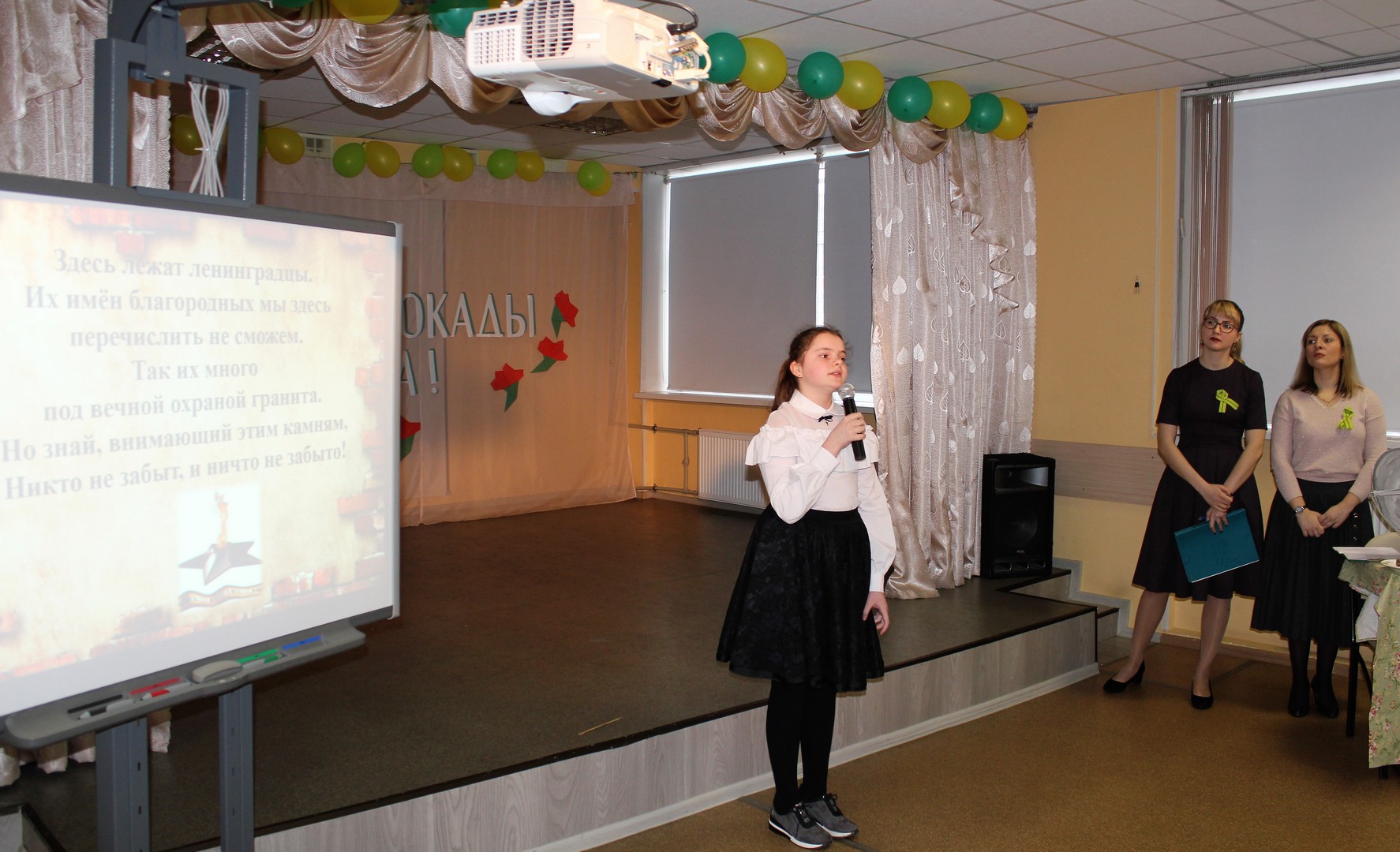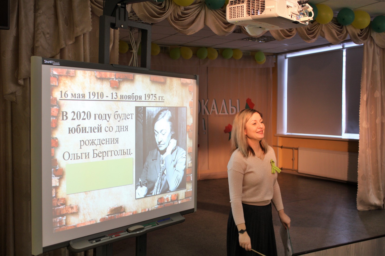28.01.2020 года в нашей школе для 5-7 классов была проведена музыкально-литературная гостиная «Ольга Берггольц – голос Ленинграда» посвященная 110 летнему юбилею О.Ф. Берггольц и снятию блокады Ленинграда. На мероприятии ребята вспомнили самые главные события блокады Ленинграда, познакомились с творчеством Ольги Фёдоровны того времени. Послушали и сами прочитали блокадные стихотворения советской поэтессы.