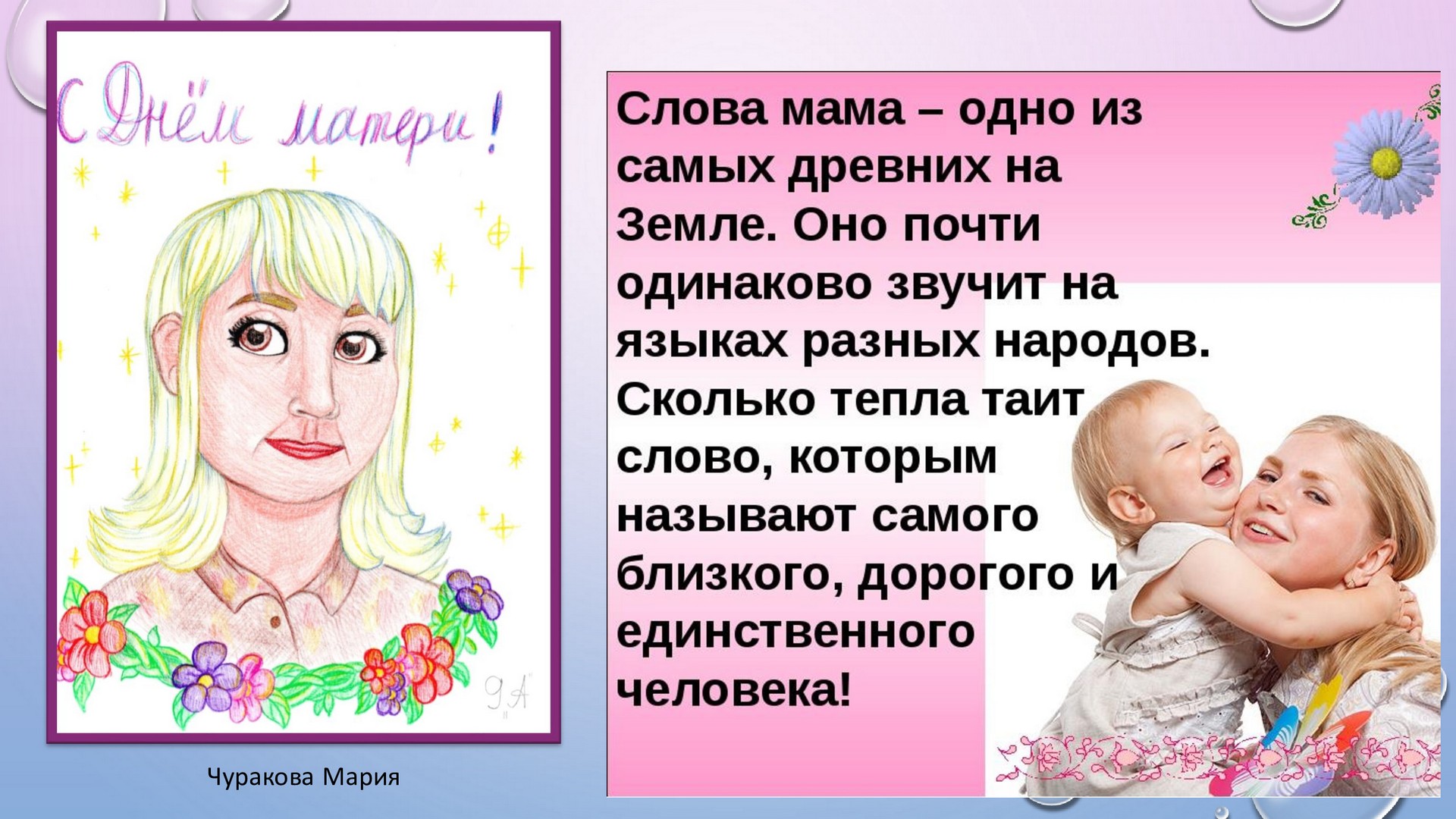 29 ноября отмечается Международный день матери. Воспитанники школы подготовили выставку рисунков, посвященную этому празднику.
