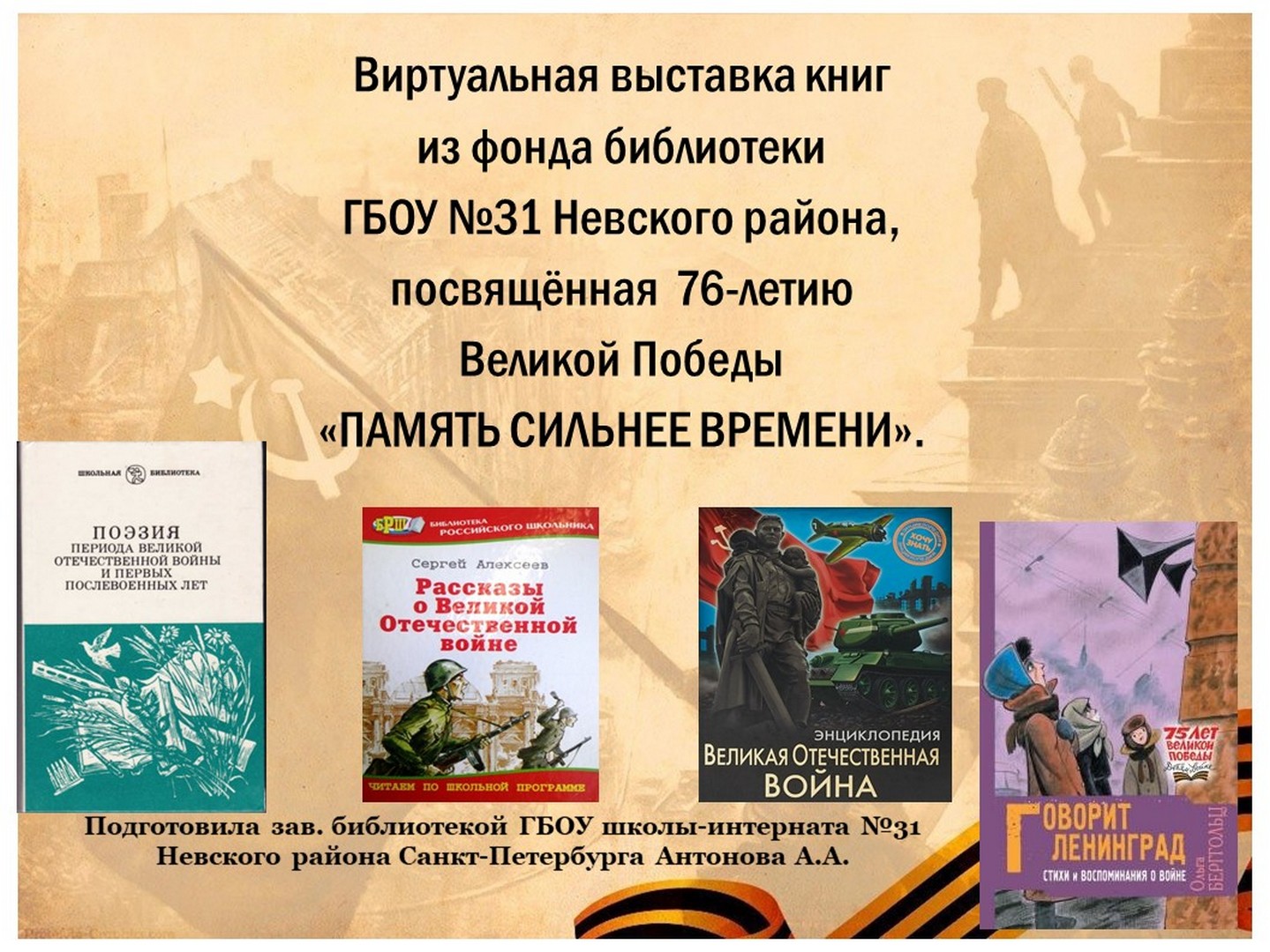 Виртуальная выставка книг из фонда библиотеки ГБОУ №31 Невского района, посвящённая 76-летию Великой Победы "Память сильнее времени"