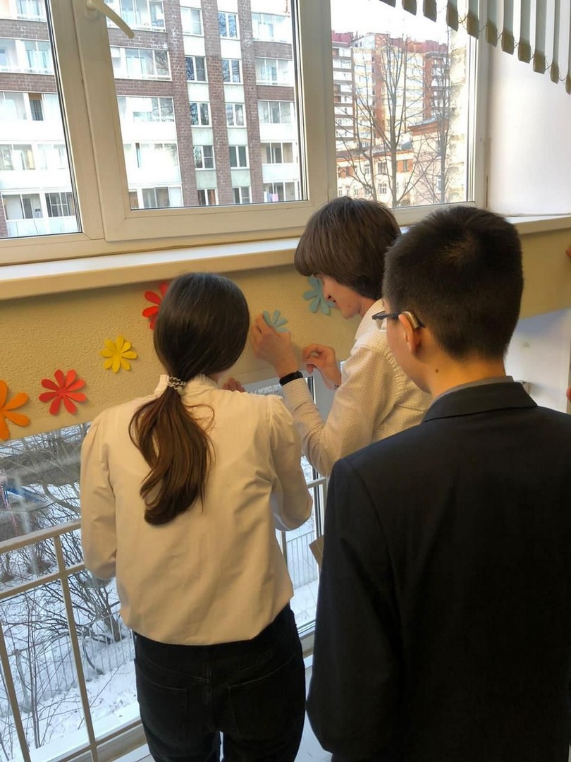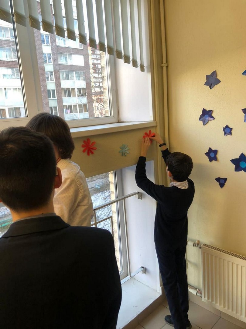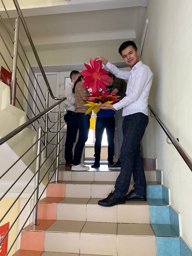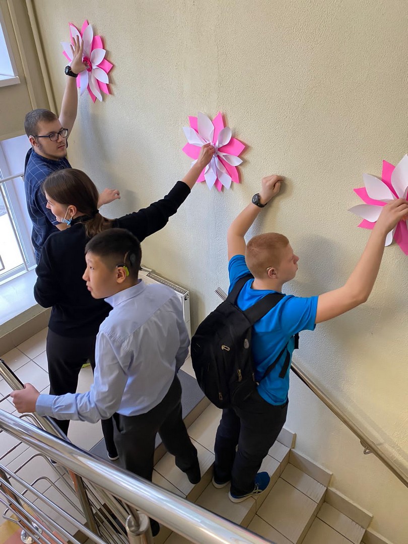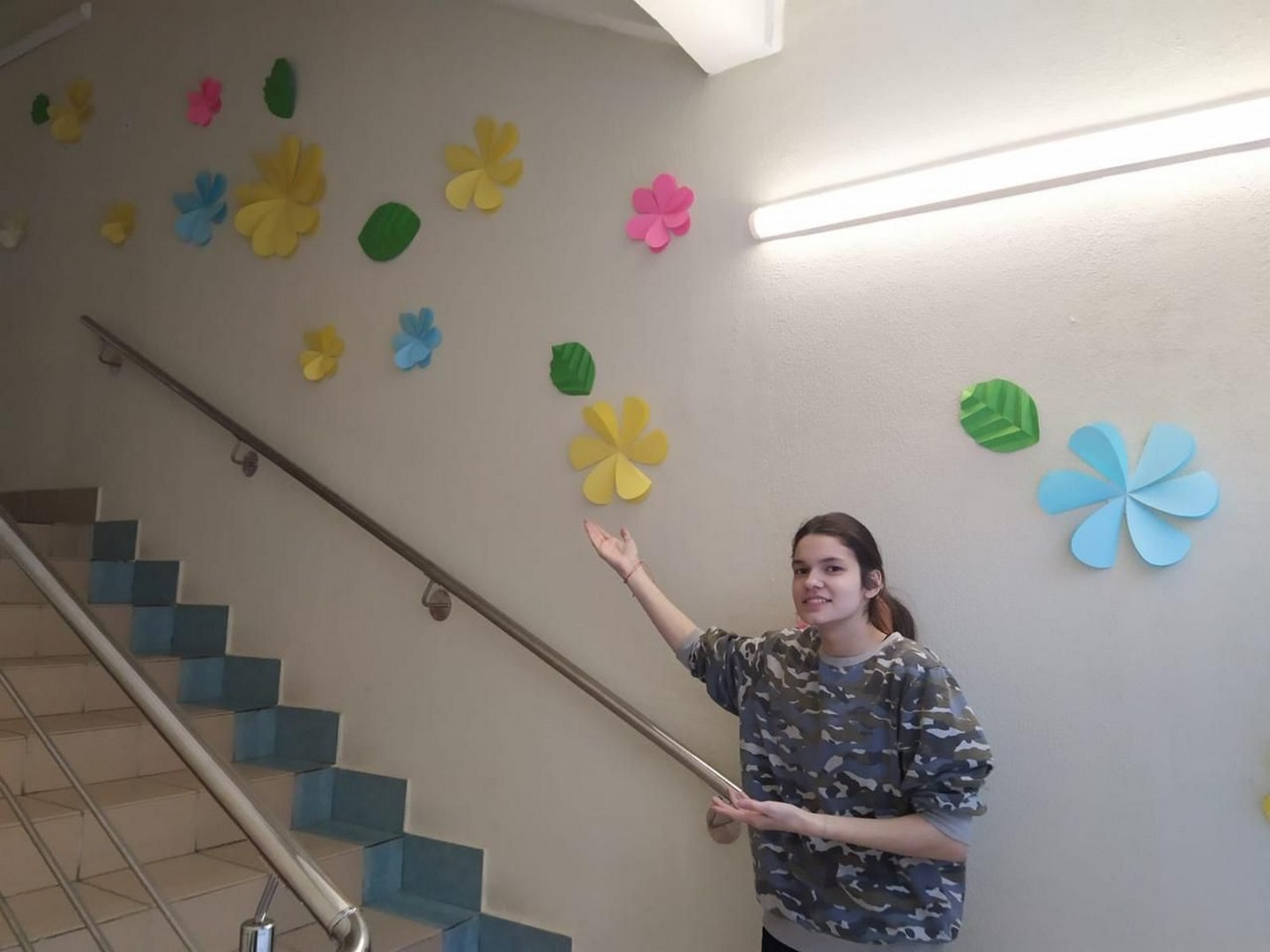 В школе Для учителей и учеников ожидал яркий, впечатляющий подарок к 8 марта на лестнице... Дети старшей школы сделали нашу лестницу очень по-весеннему. Когда на улице все начинает таять, а у нас в школе уже цветочки появились.