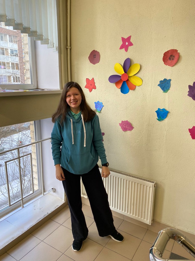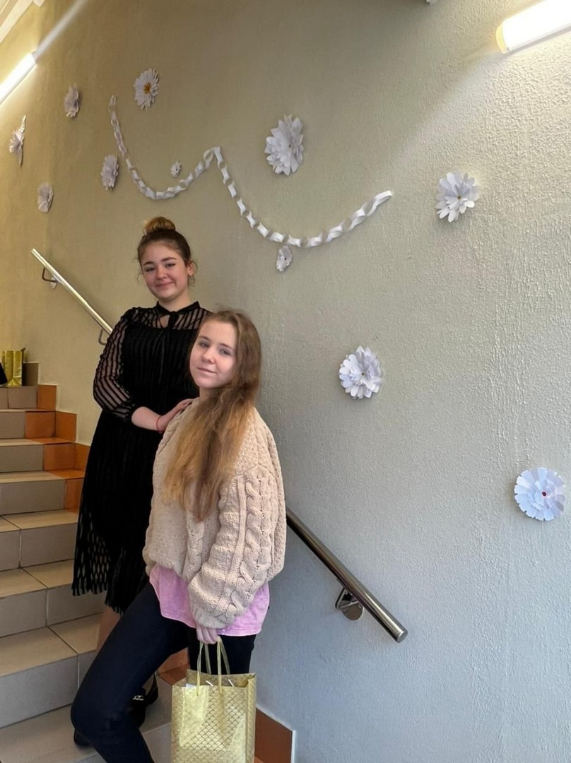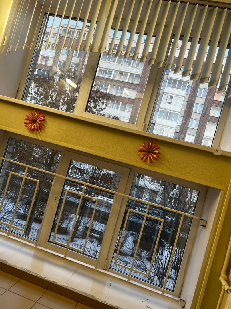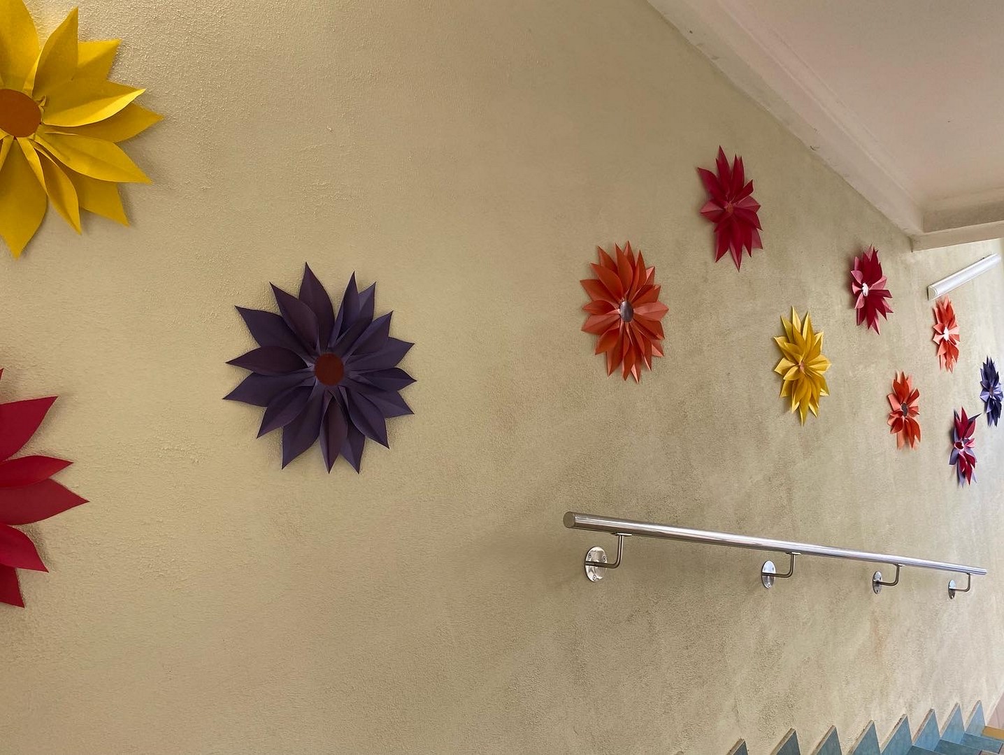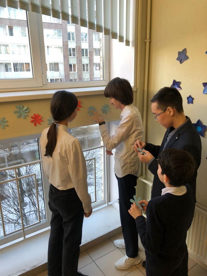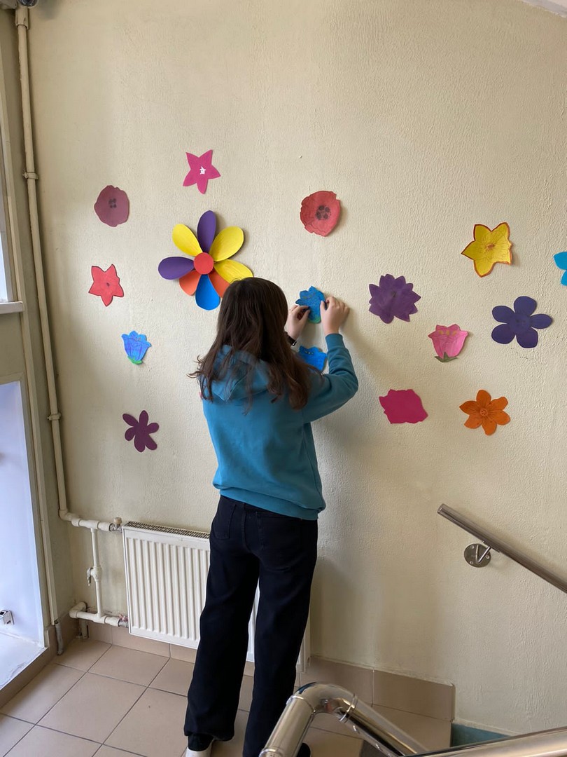 В школе Для учителей и учеников ожидал яркий, впечатляющий подарок к 8 марта на лестнице... Дети старшей школы сделали нашу лестницу очень по-весеннему. Когда на улице все начинает таять, а у нас в школе уже цветочки появились.
