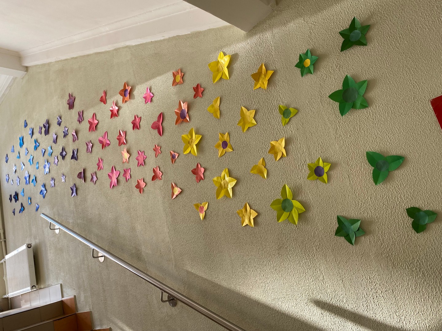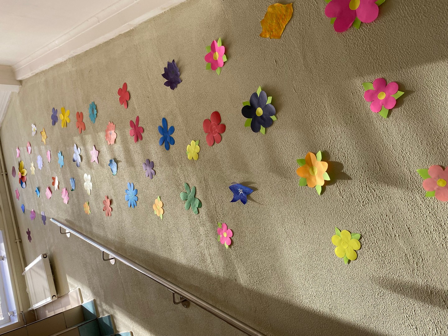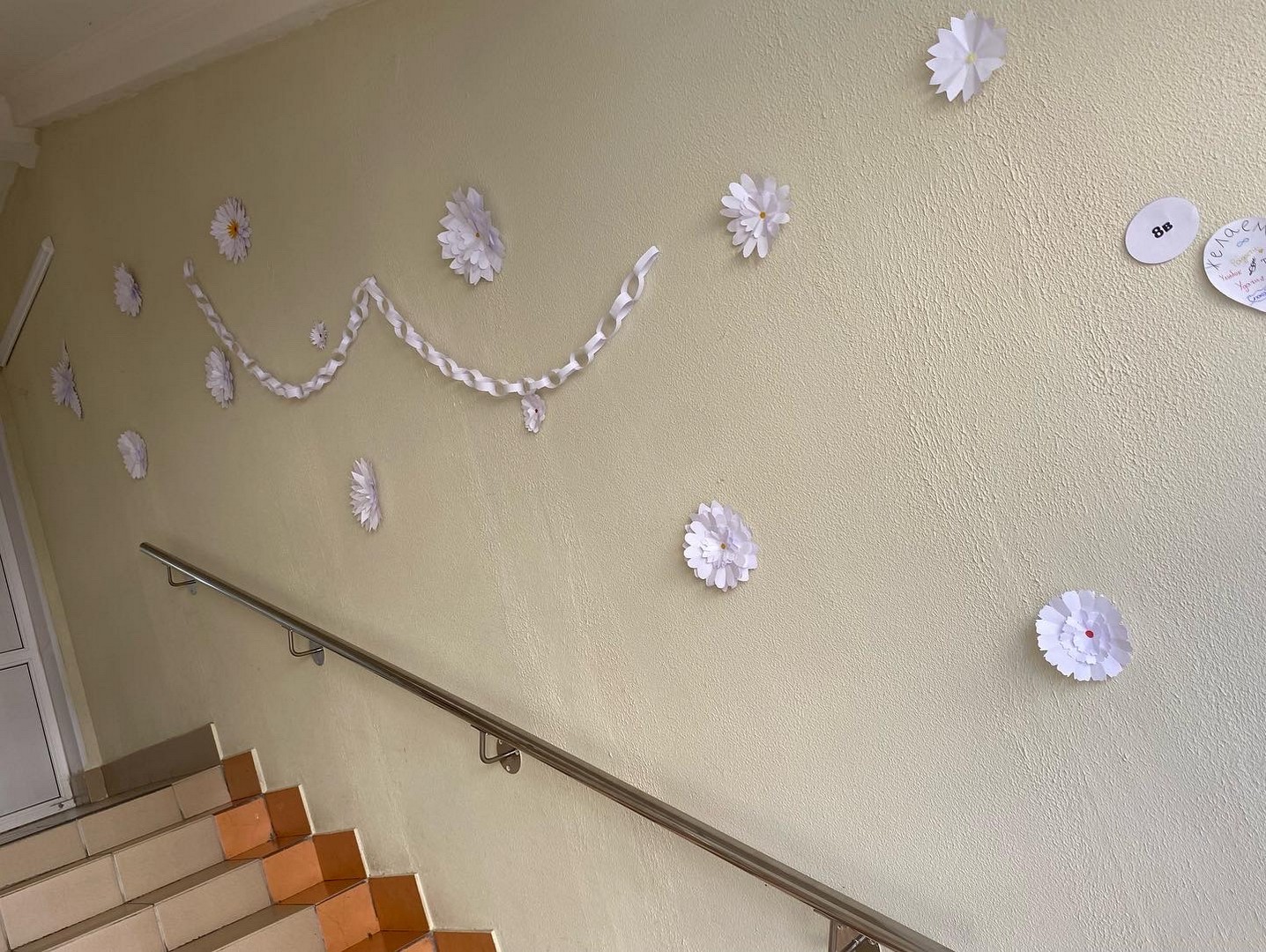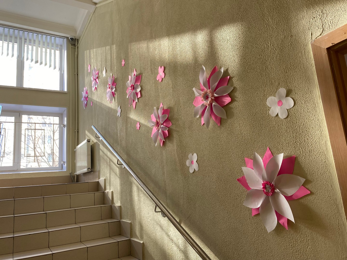 В школе Для учителей и учеников ожидал яркий, впечатляющий подарок к 8 марта на лестнице... Дети старшей школы сделали нашу лестницу очень по-весеннему. Когда на улице все начинает таять, а у нас в школе уже цветочки появились.
