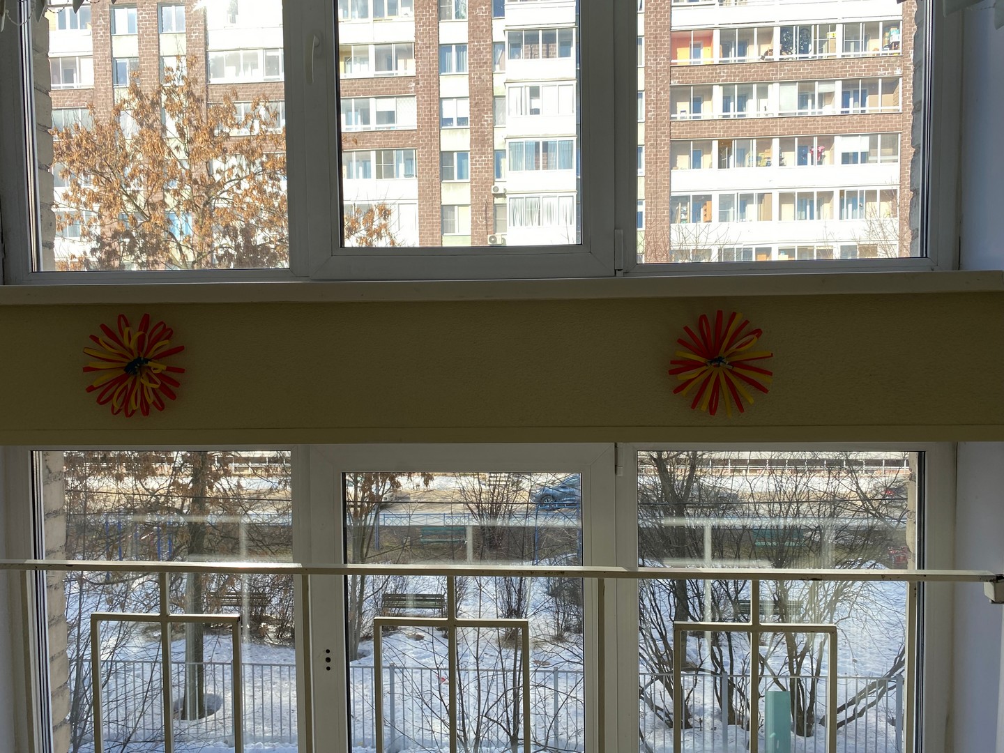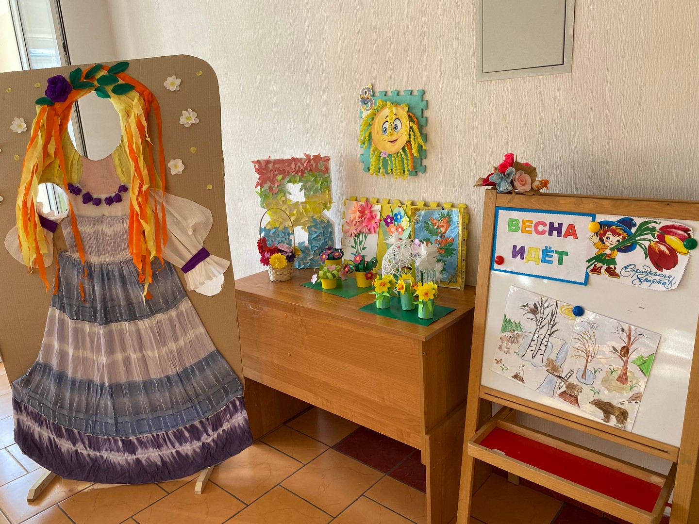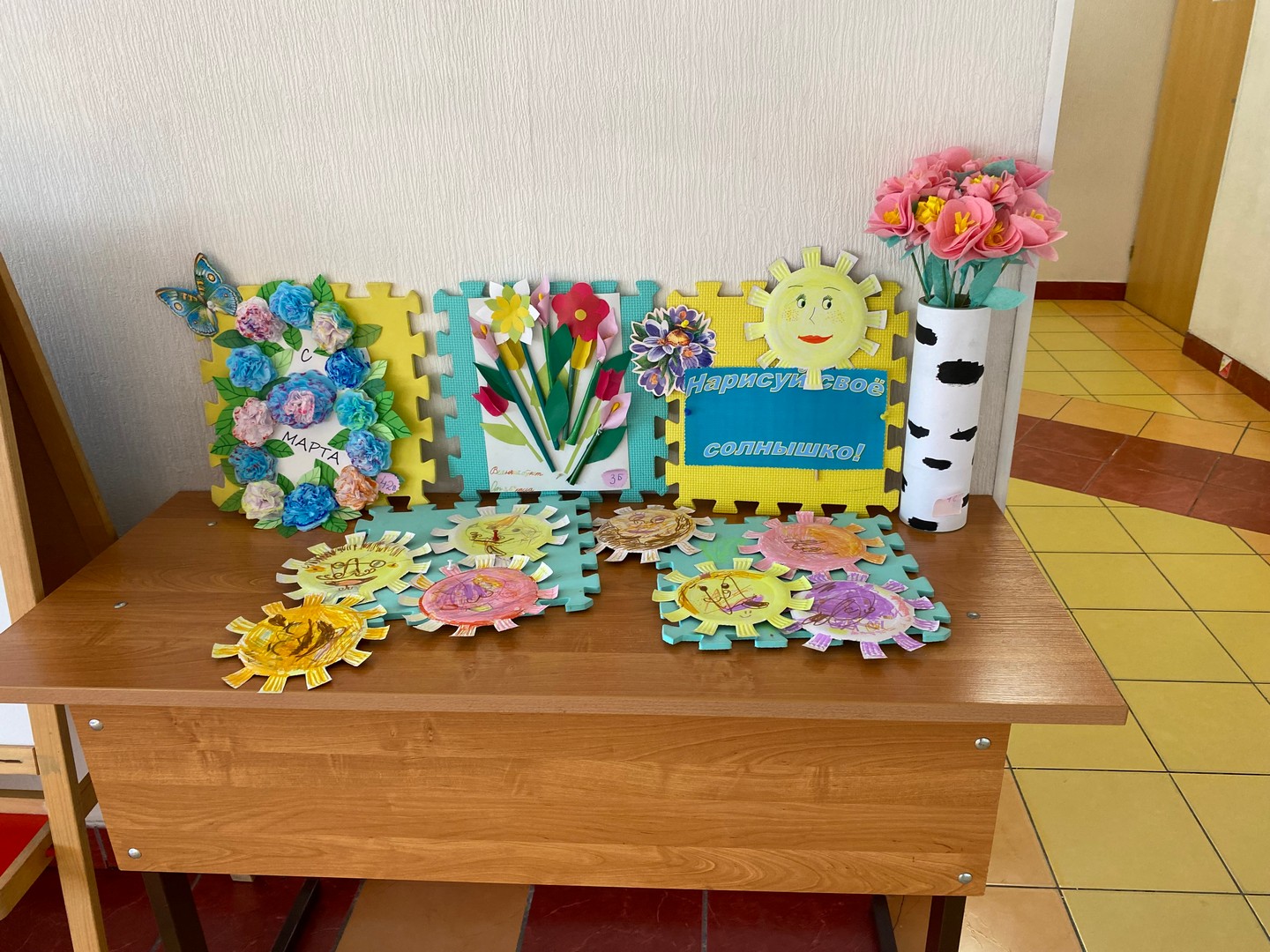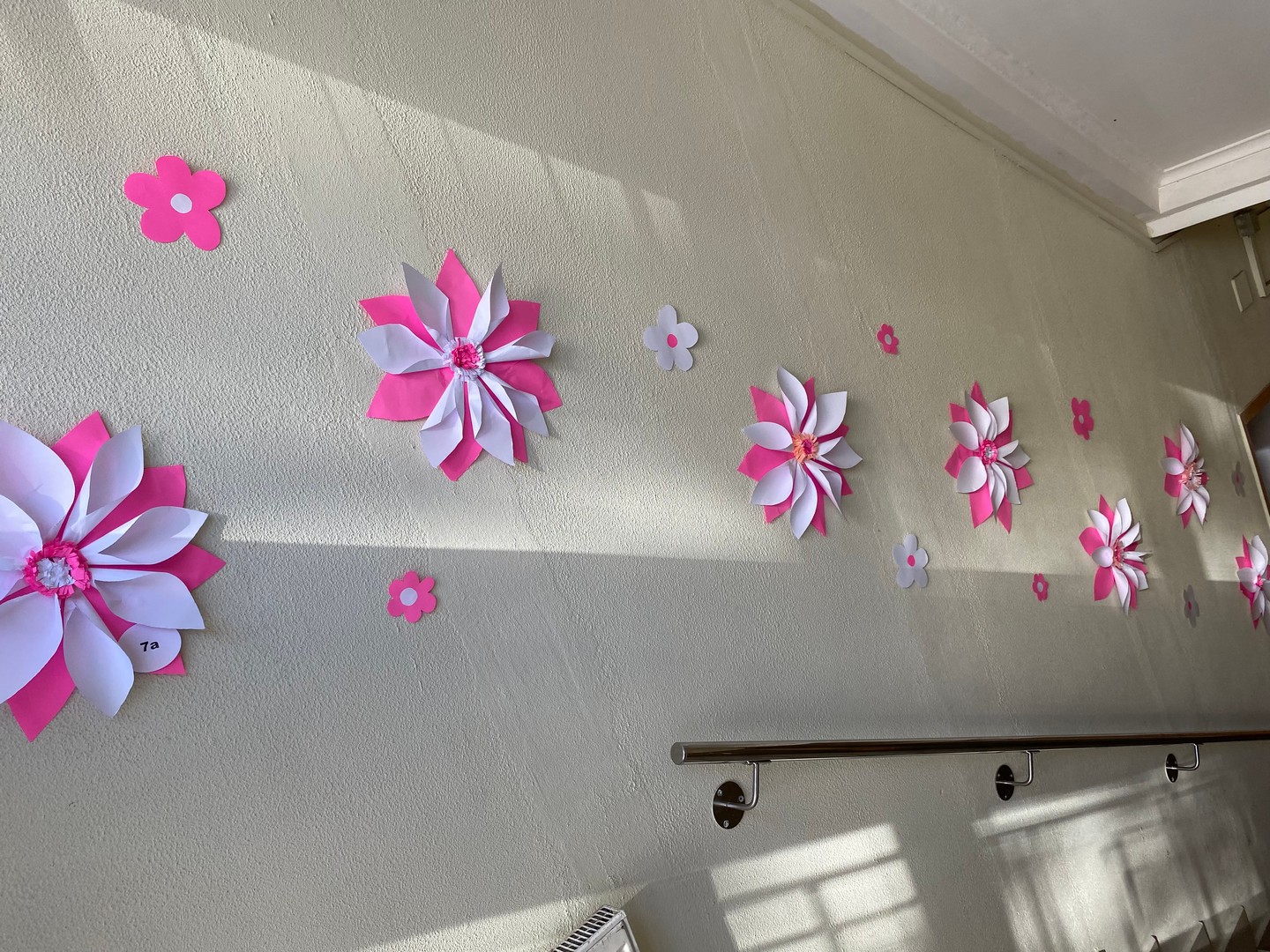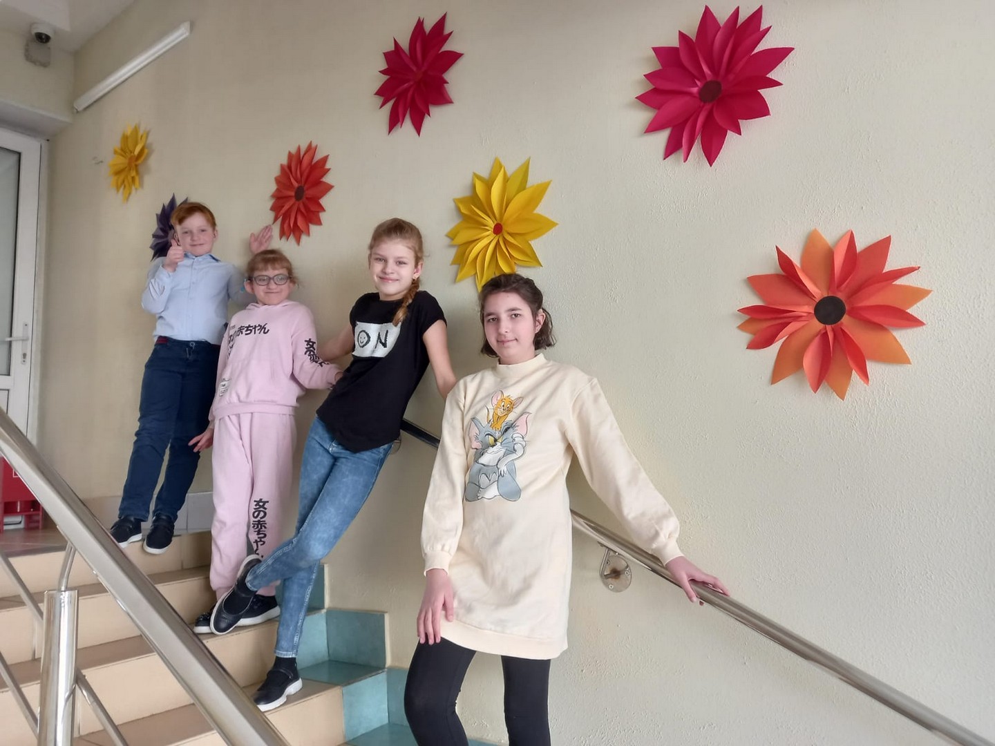 В школе Для учителей и учеников ожидал яркий, впечатляющий подарок к 8 марта на лестнице... Дети старшей школы сделали нашу лестницу очень по-весеннему. Когда на улице все начинает таять, а у нас в школе уже цветочки появились.