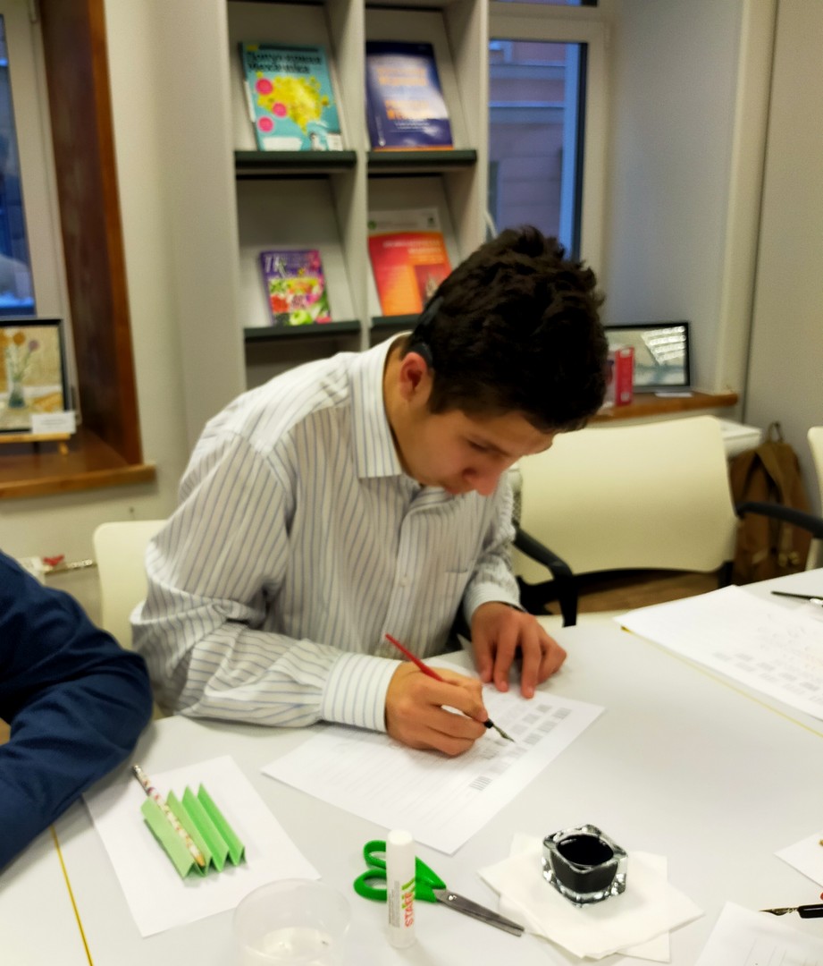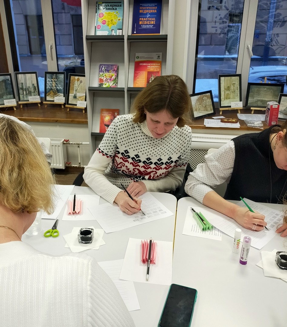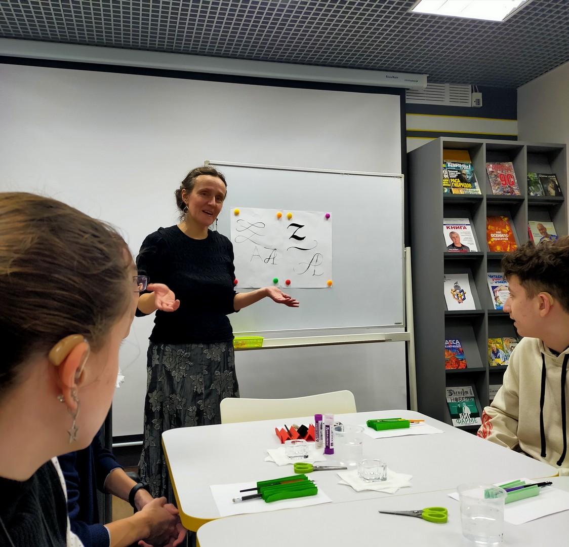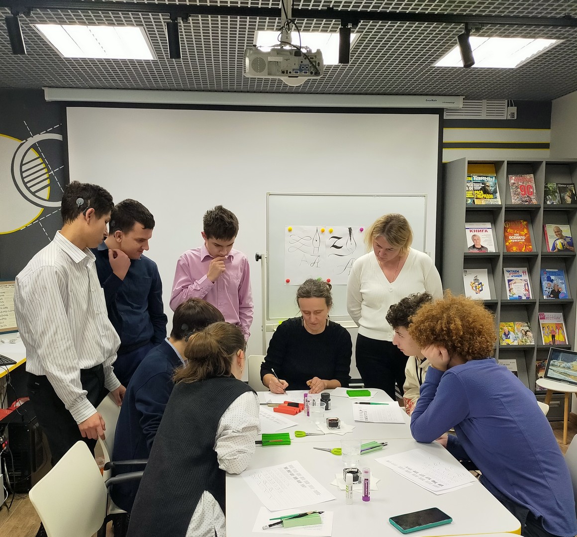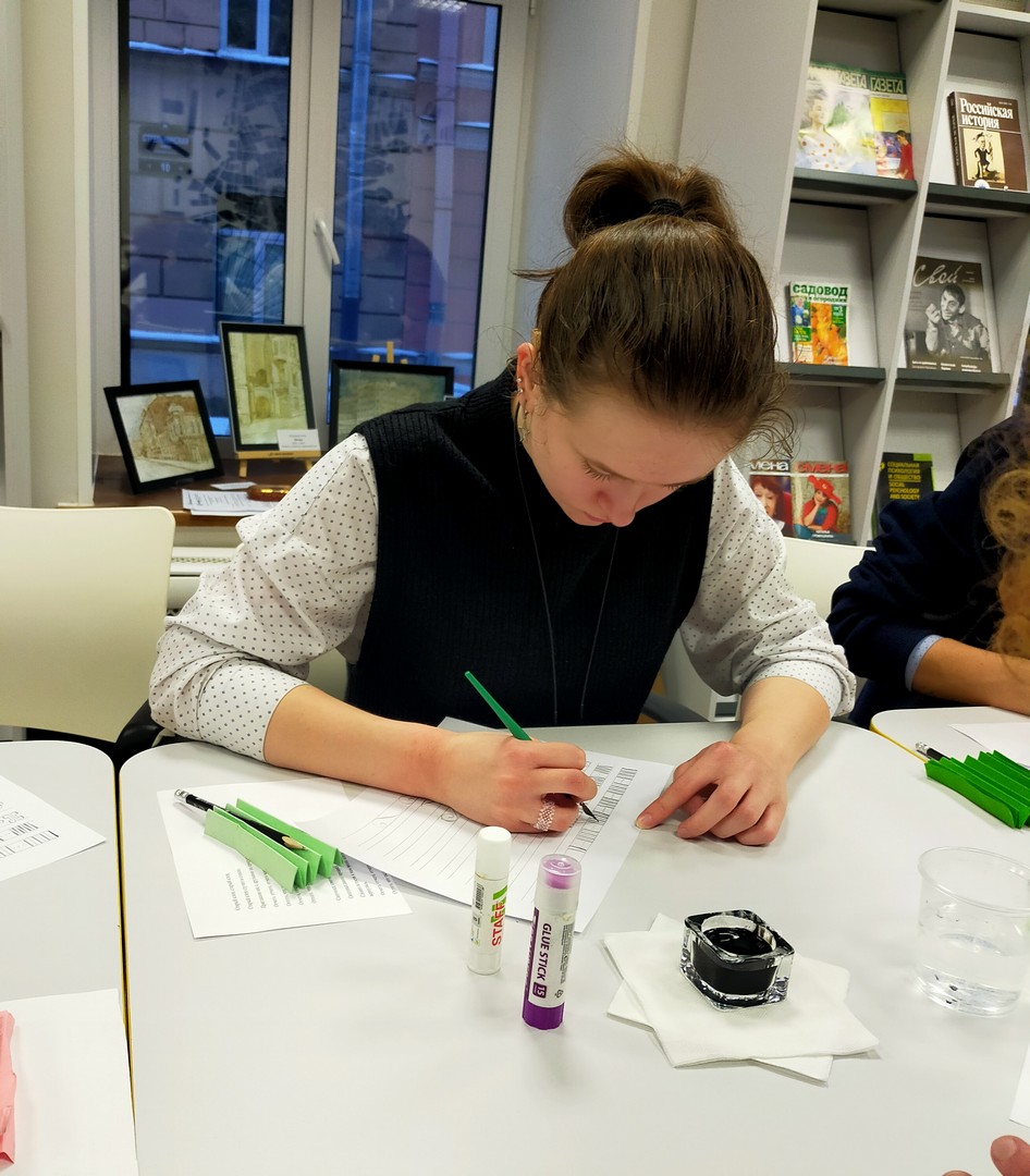 28 ноября читатели школьной библиотеки – учащиеся 7 «б» и 8 «а» классов - побывали на познавательном, интересном, обучающем мастер-классе по каллиграфии «Русская вязь» в «ГСЦ библиотеке для слепых и слабовидящих».