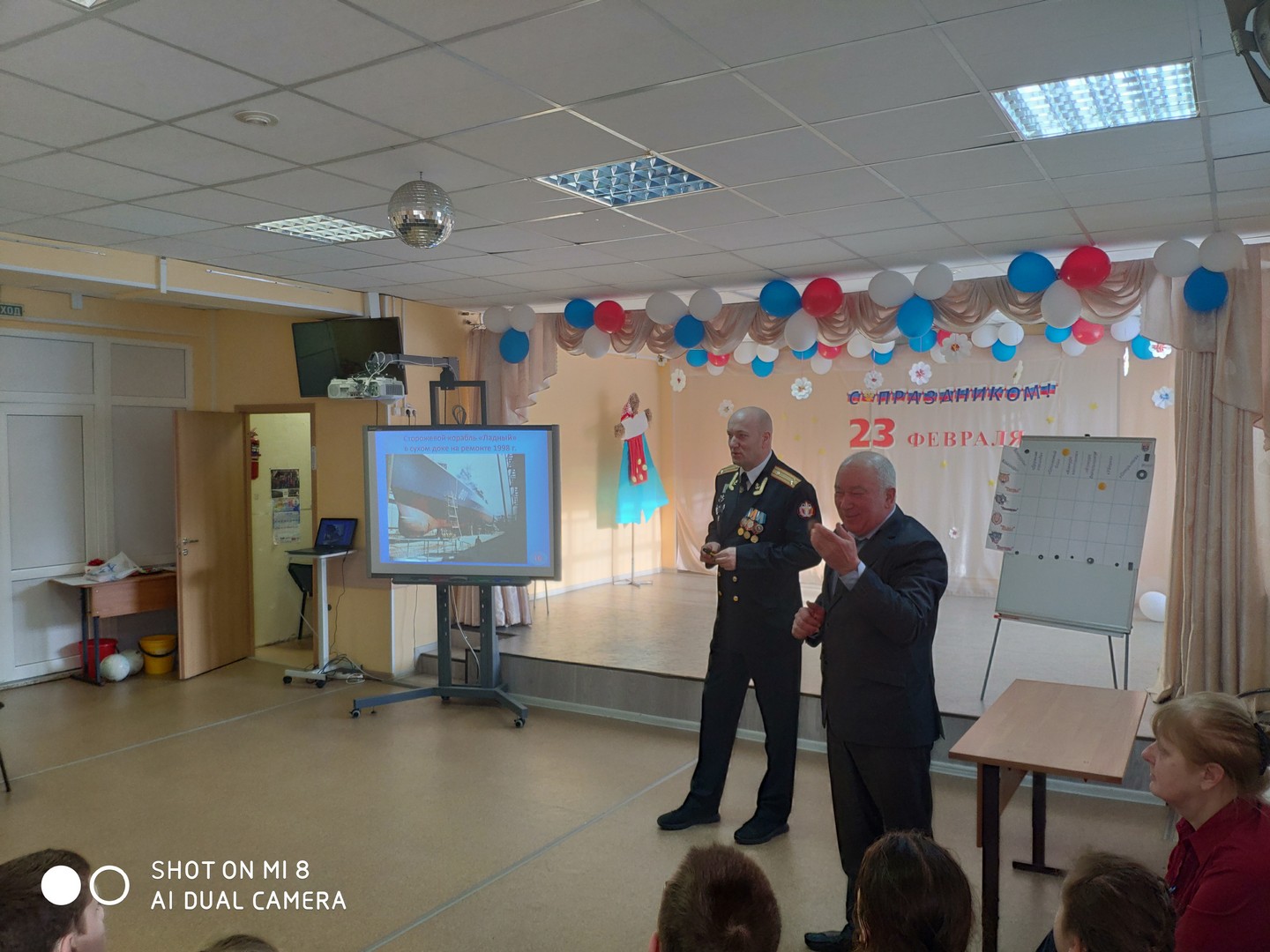 Он рассказал о развитии и оснащении современного военно- морского флота, показал в презентации корабли, на которых ходил в дальние учебные походы, виды подводных и надводных кораблей и их грозное боевое оружие. В конце встречи Эдуард Николаевич  пожелал всем ребятам успехов в учебе, быть добрыми и помогать тем, кому нужна защита и помощь. Встреча прошла для учащихся интересно и познавательно.